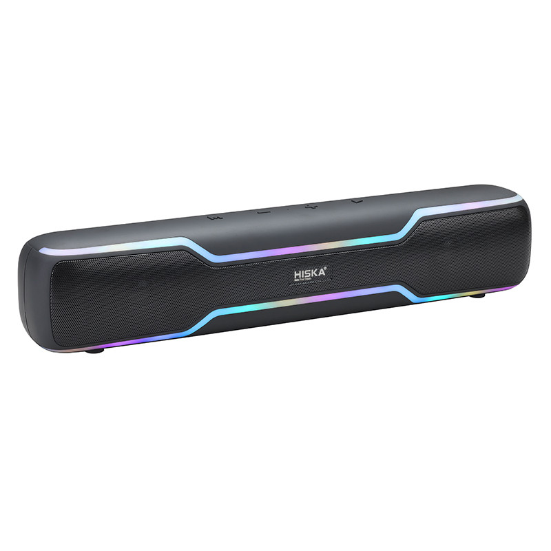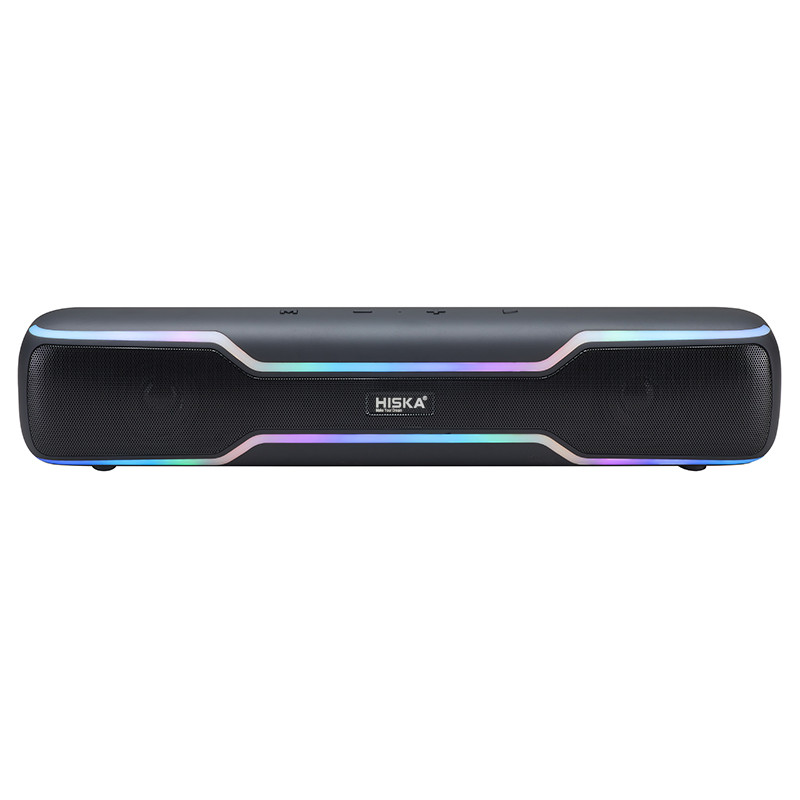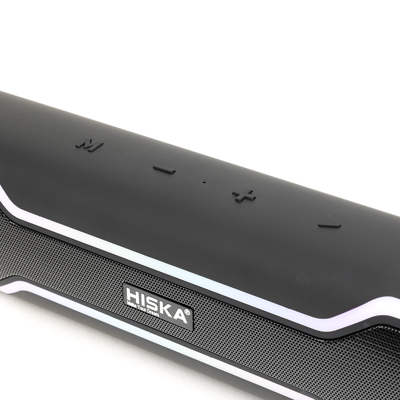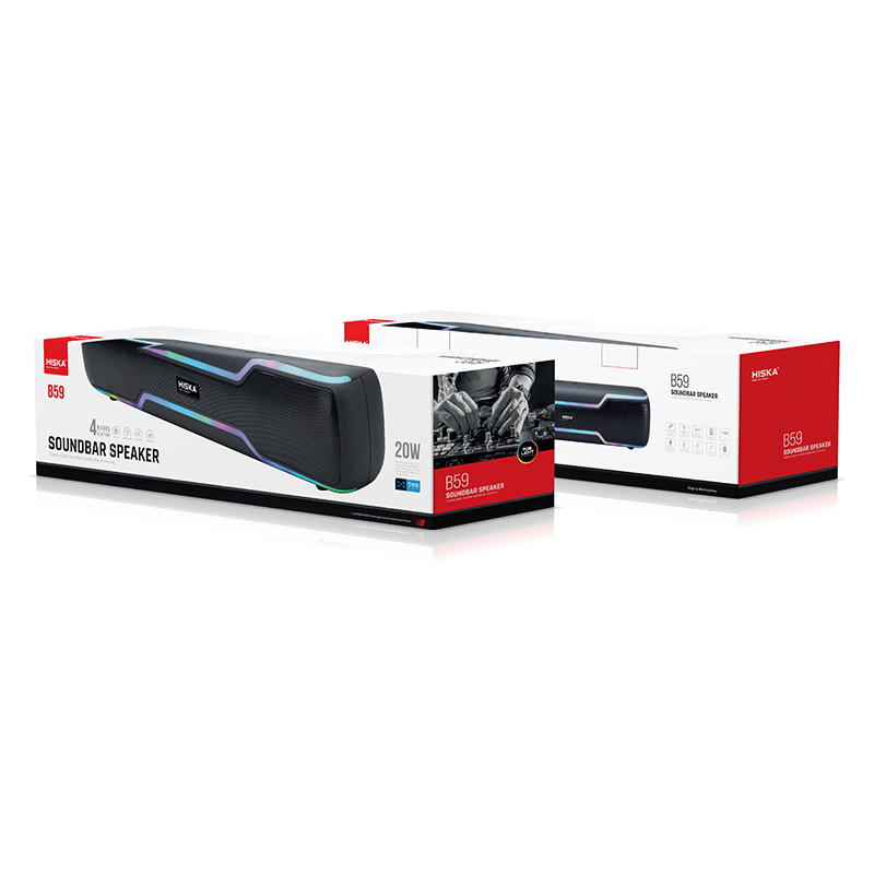 اسپیکر بلوتوث هیسکا مدل B59 با طراحی زیبا و کشیده با ابعاد 80×70×400 میلیمتر و وزن در حدود 1000 گرم مناسب برای انواع دورهمی و مهمانی های کوچک در خانه میباشد. از مشخصات ظاهری آن ترکیب رنگ مشکی مات با یک نوار باریک RGB رنگ که در بالا و پایین اسپیکر قرار دارد و پنل کنترل و مدیریت که به زیبایی بر روی آن طراحی شده است. این پنل شامل کلید مود M , کلید مثبت و منفی برای کم و زیاد کردن صدا و عقب جلو کردن ترک ها و همچنین کلید Play , pause می باشد. نوع اتصال به این اسپیکر بلوتوث هیسکا مدل B59 به دو صورت بیسیم و با سیم (بلوتوث، USB، میکرو SD card و یک ووردی جک 3.5 میلیمتری برای اتصال کابل aux) که شما بر حسب نیاز خود می توانید به بلندگو متصل شوید. همچنین مناسب با انواع گوشیهای موبایل، تبلت ها، کامپیوتر و هر دو سیستم عامل های IOS ، Android یا سایر دستگاه های Bluetoooth براحتی جفت میشود. از پارامتر های این بلندگو بی سیم ورژن بلوتوث 5.3 ، برد 10 متر و پشتیبانی از پروفایل های صوتی L2CAP / A2DP / AVCTP و همچنین میتواند دو فرمت صوتی WMA/MP3 در حالت فلش و کارت حافظه TF Card به راحتی اجرا کند؛ این دستگاه مجهز به رادیو با موج FM و قابلیت اسکن خودکار و ذخیره کانال های رادیویی میباشد. کیفیت صدای عالی و قدرتمند با توان خروجی کلی 10W×2 با درایور های 52 میلیمتری، با رادیاتورهای فرکانس پایین که با افزایش فشار صدا و فرکانس پایین قادر هست صدای را فوق العاده پویا، شفاف و واضح را پخش کند. باطری داخلی این اسپیکر از نوع شارژری و لیتیومی با ظرفیت 3000 میلی آمپر ساعت که می توانید با هر بار شارژ کردن آن، حداکثر تا 4 ساعت مداوم به موسیقی با صدای نرمال گوش فرا دهید.