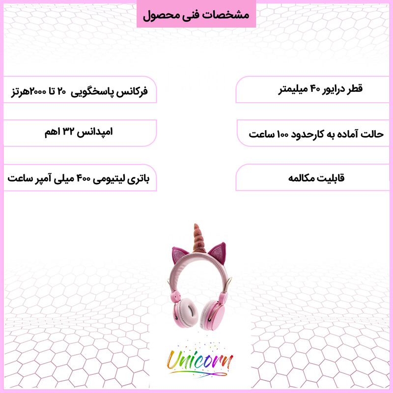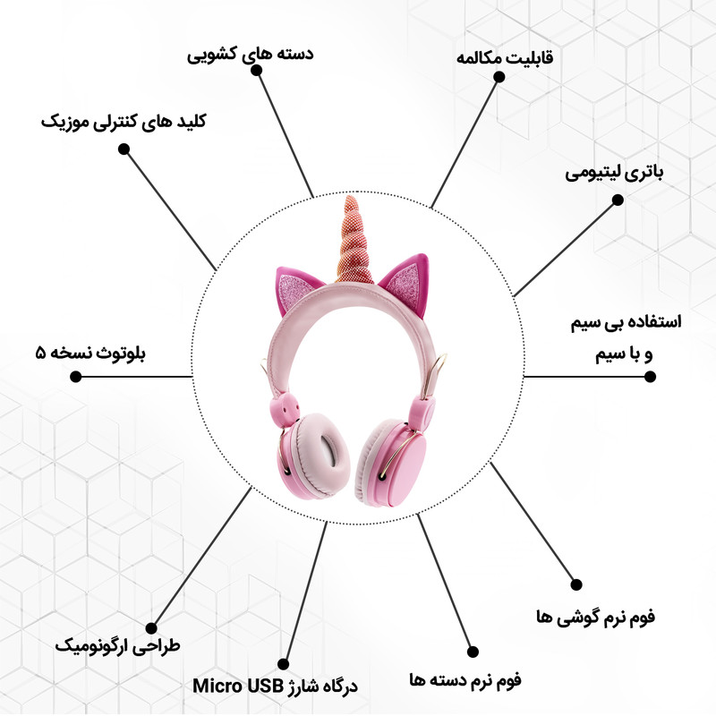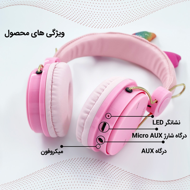 | سایر مشخصات | دسته های متحرک - بالشتک های چرمی و بسیار راحت - طراحی ارگونومیک و فانتزی - اتصال از طریق بلوتوث و کابل (جک 3.5 میلیمتری) - قابلیت مکالمه - مناسب برای هدیه (مخصوصا کودکان) – درگاه ورودی شارژ Micro USB - ورودی درگاه AUX - قابلیت چرخش نود درجه دسته ها - خاموش شدن خودکار در صورت عدم استفاده - باتری با دوام - اسپیکرهای 40 میلیمتری - فاصله عملکرد و برد حدودا 15 متر - بلوتوث ورژن 5 - قابل اتصال به تمام دستگاه های دارای بلوتوث - قابل اتصال به تمام دستگاه ها با کابل AUX - امپدانس 32 اهم - راحتی در استفاده طولانی مدت و بدون خستگی - مناسب برای کلاس های آنلاین، مکالمه و موزیک |