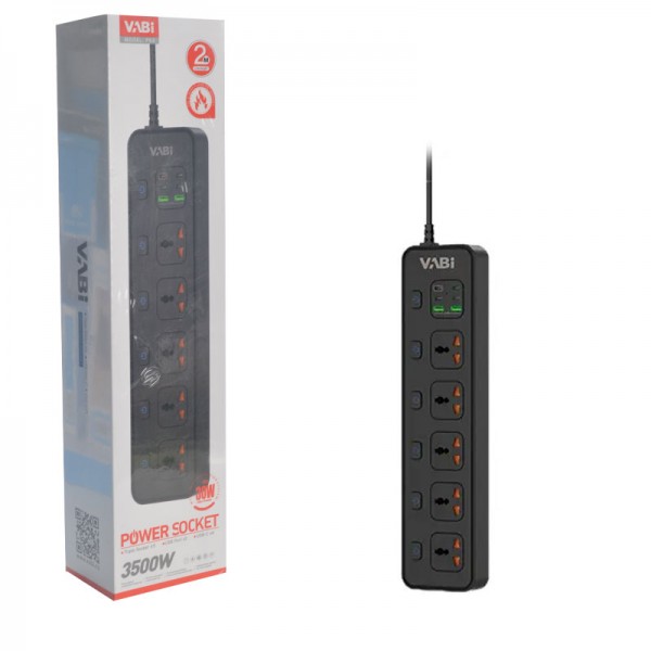 توضیحات VABI PS3 Power Strip with USB & Type-C Fast Charging – 5 Universal Sockets