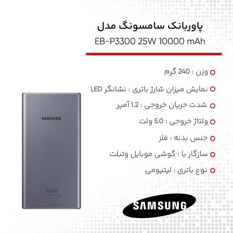 در عصر مدرن که تمامی کارهایی که باید در طول روز انجام شود به صورت اپ و در گوشی قرار گرفته است به یک شارژر همراه نیاز خواهیم داشت. البته این تنها استفادهی این محصول نیست و برای شارژ کردن لپتاپ و حتی تبلت نیز باید از همین مورد استفاده کنید. تصور کنید هر روز بعد از کار باید با تبلت در کلاس آنلاین خود شرکت کنید، در این صورت زمانی که از سرویس برگشت شرکت استفاده میکنید به صورت همزمان در کلاس خود حاضر میشوید و با استفاده از پاوربانک از تمام نشدن شارژ تبلت اطمینان حاصل میکنید. شارژر همراه سامسونگ مدل EB-P3300 در ظرفیت 10000 میلیآمپر تولید و عرضه میشود و به شما این امکان را میدهد تا دو دستگاه مجزا را به صورت همزمان شارژ کنید. این محصول این امکان را به شما میدهد تا از فناوری شارژ سریع استفاده کنید و بدنهی این محصول برای اطمینان از مقاوم بودن آن از فلز ساخته شده است.