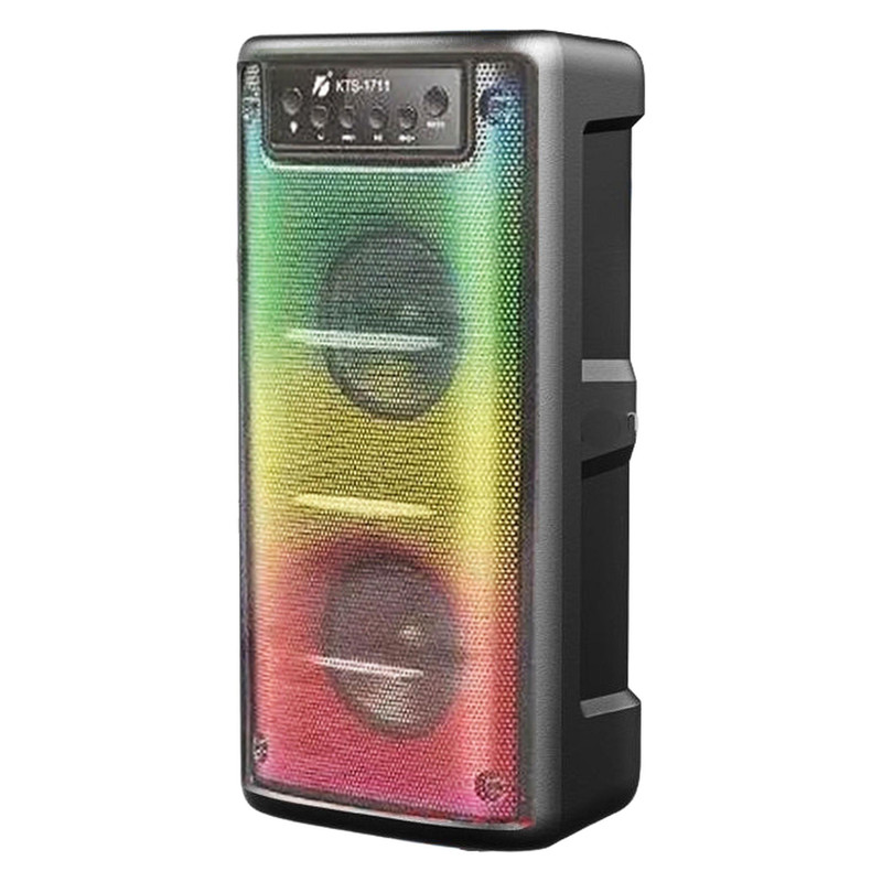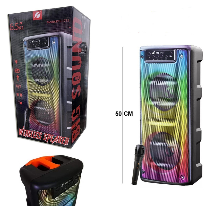 اسپیکر شارژی قابل حمل مارک کی تی اس مدل KTS-1713 دارای دو عدد میرنج 6/5 اینچی با کیفیت و بیس عالی و دارا بودن دکمه تنظیم باس که به صورت حداقل باس و حداکثر باس قابل کاربرد می باشد.