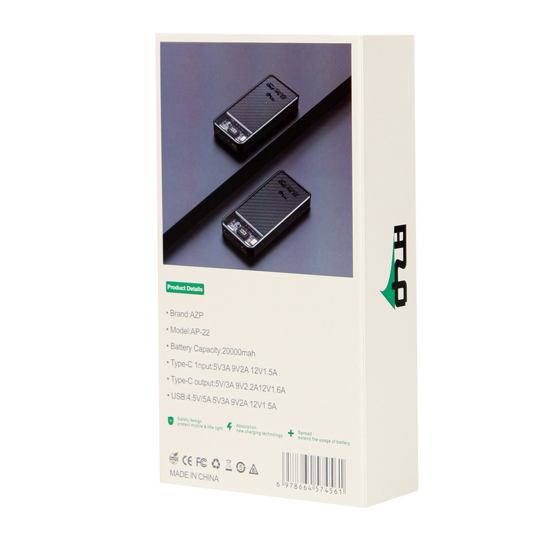 شرکت AZP محصولات بینظیری را روانه بازار کرده است که از کیفیت بسیار خوبی برخوردار هستند و از همان نگاه اول به کیفیت محصول پی برده می شود. این پاور بانک دارای چندین ویژگی منحصر بفرد می باشد که در ادامه به چند عدد از انها اشاره می کنیم. پاوربانک مدل ap-22 دارای دو عدد پورت USB و یک عدد پورت تایپ سی می باشد که مجهز به تکنولوژی سوپرفست شارژ با توان ۲۲.۵W است. این پاور بانک با نمایشگر دیجیتالی میزان دقیق شارژ پاوربانک را برای شما نمایش می دهد. ضمن اینکه این پاوربانک دارای دو درگاه ورودی میباشد، پورت اول از نوع تایپ سی میباشد که به صورت پورت مشترک ورودی و خروجی قابل استفاده است و پورت دوم از نوع لایتنینگ میباشد. از طرفی چیپت هوشمند موجود در پاوربانک با حداکثر کشش دستگاه شما جریان را منتقل می کند و باعث می شود که باعث گرمی و آسیب باتری گوشی شما نشود. به طور کلی این پاوربانک ای زد پی ap-22 دارای ۳ عدد پورت در مجموع جهت شارژ گوشی یاتبلت می باشد.